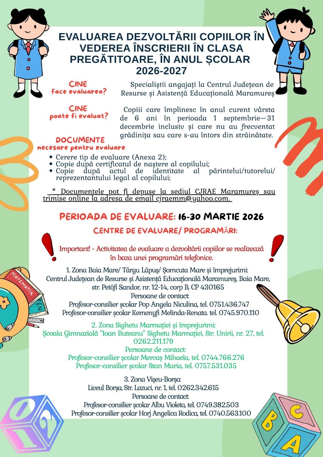 Perioada de evaluare: 16-30 martie 2026. Activitatea de evaluare a dezvoltării copiilor se realizează în baza unei programări telefonice.